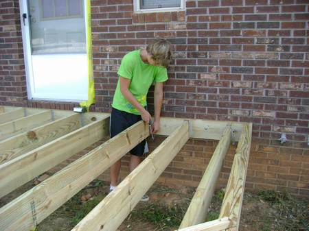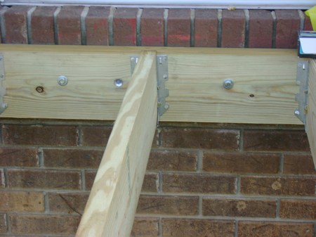 STEP TWO: LEDGER BOARD One critical step that seems to be often skipped is lag bolting the ledger board to the house (see picture #2 above). This is important because the lag bolts carry not only most of the weight from your structure but all the weight that you put on it as well. Obviously you can't nail into brick but when attaching a ledger board to a house that isn't brick, relying solely on nails alone to hold the weight is going beyond what they are designed to do. STEP 3: JOIST HANGERS (ALL WORK Deck Photo Gallery 1 | 2 | 3 | 4 | 5)