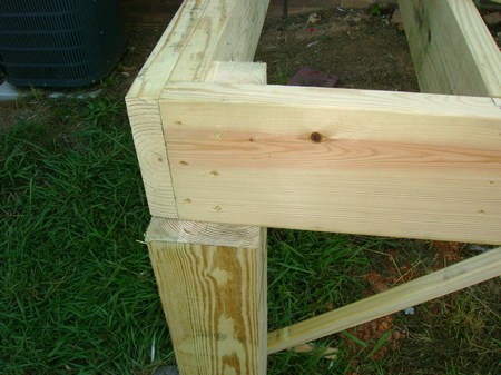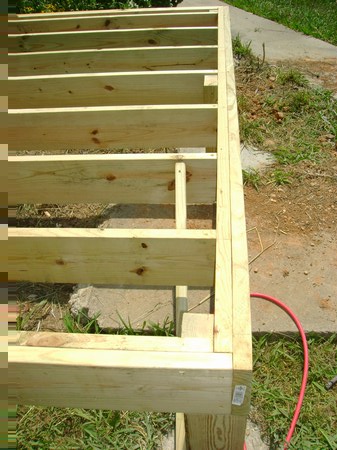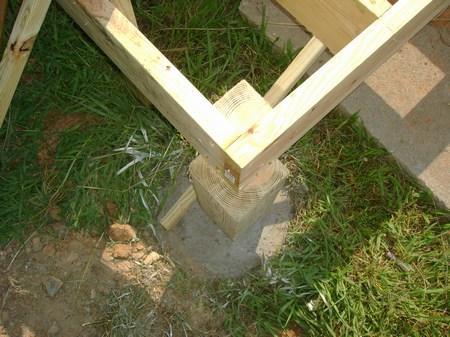 STEP FOUR: SUPPORT POST Step #4 is one of the very most important part of Deck Construction that is absent on almost every deck that we've seen in this area. Notice in picture #2 that the main support post is notched and the floor framing rests directly above it. This is what we call the "cantilever rule". Constructing anything structural or something that carries weight should have a beam or a post sitting directly under it. We use 6x6's for our support post and notch it so that the floor framing sits on top and a part of the post runs past the framing and is attached from behind. STEP FIVE: DOUBLE RIBBON JOIST Notice in the photo to the left, the outer most framing around the floor framing has been doubled. We do this to allows for extra support for the railing post. We attach the 4x4 railing post directly to the outer framing or Ribbon Joist of the floor framing after the decking boards are installed. (ALL WORK Deck Photo Gallery 1 | 2 | 3 | 4 | 5)