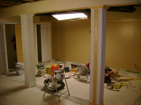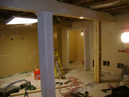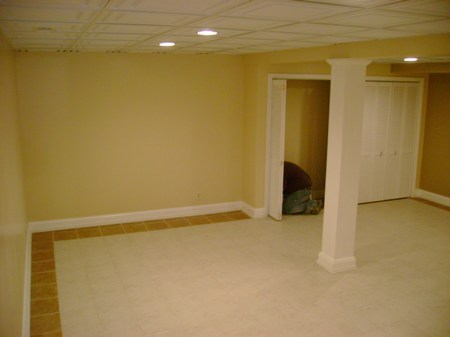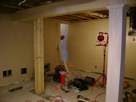 We frame up the outer walls, closets and support post then sheetrock using moisture resistant green board. ALL WORK uses the moisture resistant green board on all of our basement jobs. Basements are normally damp so we use green board even if the basement doesn't have a history of leaking.