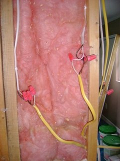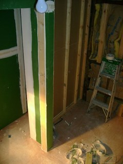 This job started out simply in a very large room framing a hallway, a separate room, a new bathroom, a closet and moving door openings and such. One problem we have encountered when removing some existing sheetrock was (faulty) wiring that was joined together outside of a junction box. This is very dangerous and can create a fire, and almost did.
