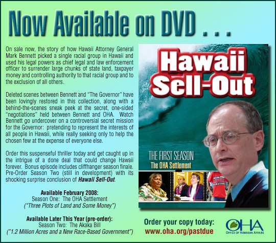 "Office of Hawaiian Affairs -- Watching the Moves It Makes to Expand the Evil Empire (acquiring huge parcels of land, building a headquarters for its tribal nation, considering purchase of a TV station, etc.). YEAR 2008"