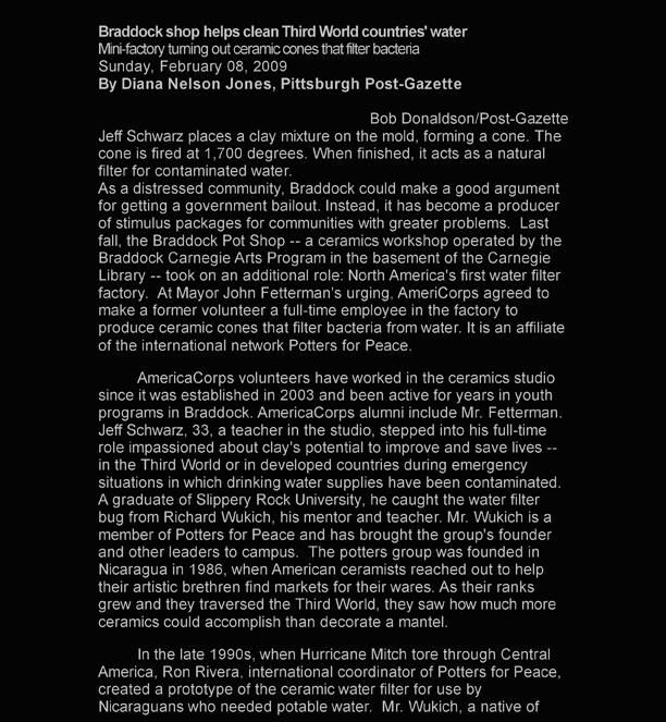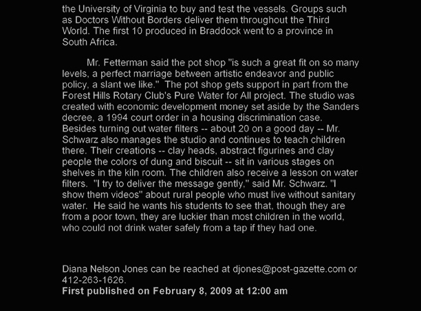 80 clay water filters to be shipped to South Africa. "Clean ... drinking water is the right of all people," said Schwarz, 33, of