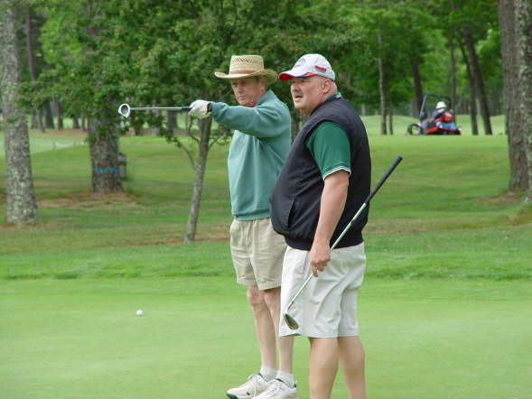 Last year's inductee to the "Exploding Golf Ball Club" discusses this year's candidate with the Commissioner. L to R: Rich Ellison & "The Commissioner" Dan Howe |