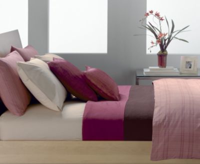 This collection, full of texture and sheen, combines burgundy tones with a dash of beige for a striking ensemble. Collection includes Abaca Weave duvet covers, comforter and shams; Tattersall sheets and pillowcases; Geranium sheets and pillowcases; Pebble Texture bedskirts, shams and duvet covers; Abaca accent pillows and Textured Plaid blankets. Please select a specific item for fabric details and country of origin.