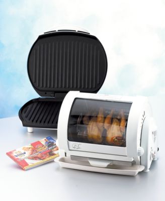 Rotisserie A one-two punch of flavorful, healthy cooking for the whole family. The George Foreman Lean, Mean, Grilling Machine lets you grill meats, fish, and veggies for taste and nutrition. A separate George Foreman Rotisserie is included and lets you roast poultry, meats, and kebobs with succulent flavors. Non-stick coated cooking surfaces are easy to clean. Model #GR3659A. Limited warranty. |