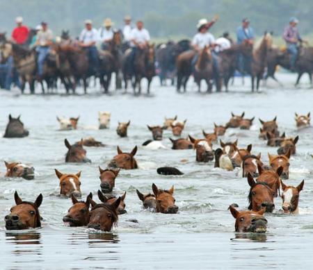 The Pony SwimThere are two herds of ponies living on the beautiful Island of Assateague. Seperated by a fence at the state line between Virginia and Maryland, the ponies are found in each state wandering the beaches and sometimes roads. Each herd is managed differently, the Maryland herd by the National Park Service and the Virginia herd by the Chincoteague Fire Company. Each year, the Virginia herd is rounded up by the Fire Company for the much heard about 'Pony Swim.' Pony Penning began as a way for farmers to claim their propety and break the ponies in, during the late 1600's. Around the 1700's Penning turned into a yearly event known around the world, there were good times, alcohol and carnivals.By 1885, word had spread and hotels were booked far in advance and the island was crazy. In 1909, the dates were finally set to the last Wednesday, Thursday and Friday in July each year. (Assateague also had a sheep penning, that finally was discontinued in 1914).
