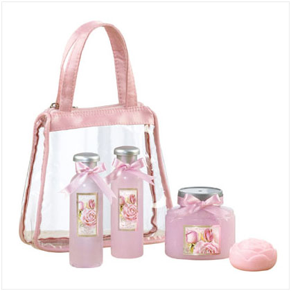 of the 60's holds a set of peaceful tea rose scented bath products.