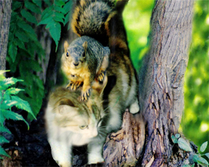 Squirrel & Cat While working on my business papers, my gaze was drawn to the window and the always present activity outside near the bird feeders. Squirrels were having their way with the seed. One squirrel in particular was not satisfied in chasing all the birds away but he also challenged other furry brothers and sisters even though the feeders they were raiding were in trees other then "his." Oh, what a bold little fellow. He raced along a branch of his home tree and leapt across to the next. Down he sped to the level of the next feeder. With fierce abandon, he pounced on the other squirrel. Loud chucks and screams followed. The enemy was quick to scramble off as far away as my eyes could follow. With a loud chuck and flick of his tail Squirrel demonstrated that he was king of all the feeders in the area. Emboldened with his bravery, he decided to venture down the tree to stuff himself on the marshmallows I threw out on the ground in an effort to minimize the toll he was taking on my birdseed stores. Now at the base of that tree sat a very patient calico cat named Halloweh, which, I was told by my daughter, means beautiful in another language. Halloweh was ever so quiet as she sat gazing upward. Squirrel hung on the tree gazing downward. He saw no movement in the area of those marshmallows so down he cautiously crept. Cat could hardly contain herself. Squirrel was only a few feet above her. Squirrel kept coming down. Cat sat still. Now squirrel was only inches from Halloweh. He surmised that he needed to step on something before reaching the ground. Cat held her position... He stepped off onto a tricolored thing that was actually Holloweh's head. Cat tried to throw him in the air and catch him. Squirrel tumbled through the air and landed a few feet away at the base of a bush. He scrambled up the bush but it took him only up a few feet. Cat leapt up the bush, but squirrel jumped off and ran back up the tree he had come down. Cat ran up the tree after him but was no match for the swiftness of squirrel. At about the 20 foot level, cat gave up. Now, how to get down? Halloweh is a plump housecat not given to much exercise. She scrambled on to a nearby branch as if to look further into the matter of squirrel catching. Soon it was obvious to me that Halloweh would not be coming down by herself. I let her stew on her situation for a half hour. Relenting, I got out my ladder and she allowed me to rescue her. She decided to come directly in and sit by the fire to cozy herself from her ordeal. [Betsy Fiore is owner of Bethany Painting, Bethany Beach, Delaware, 302-539-3623]