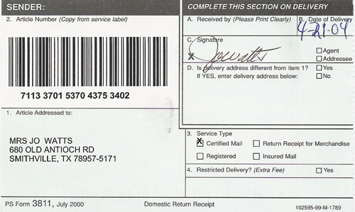 I send her a letter to this affect, certified. I sent it via the Internet, which shows it posting in some other state. I believe she panics and thinks I will be moving away with Severn. This was brought up by her attorney in court, (the a return address on the envelope).