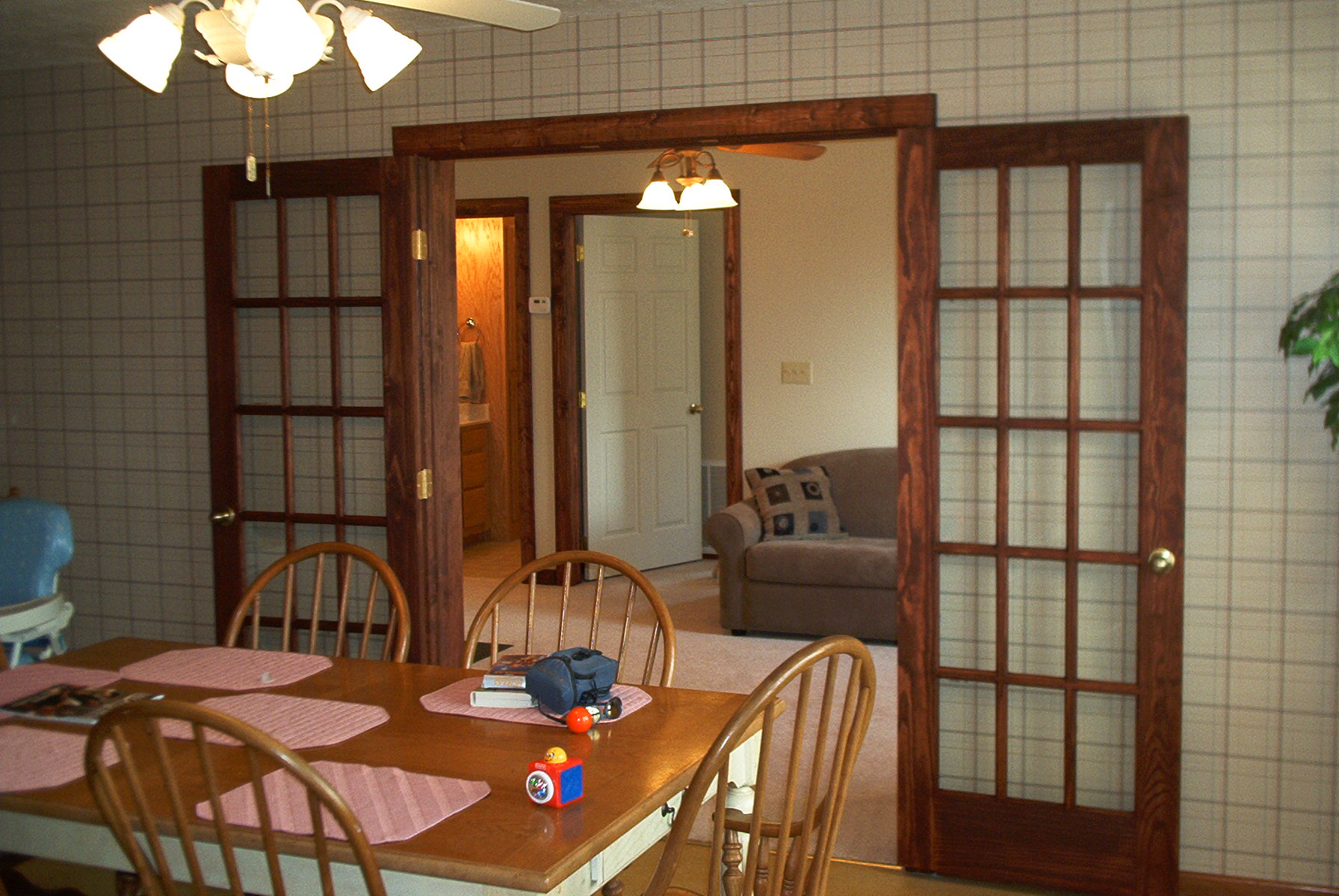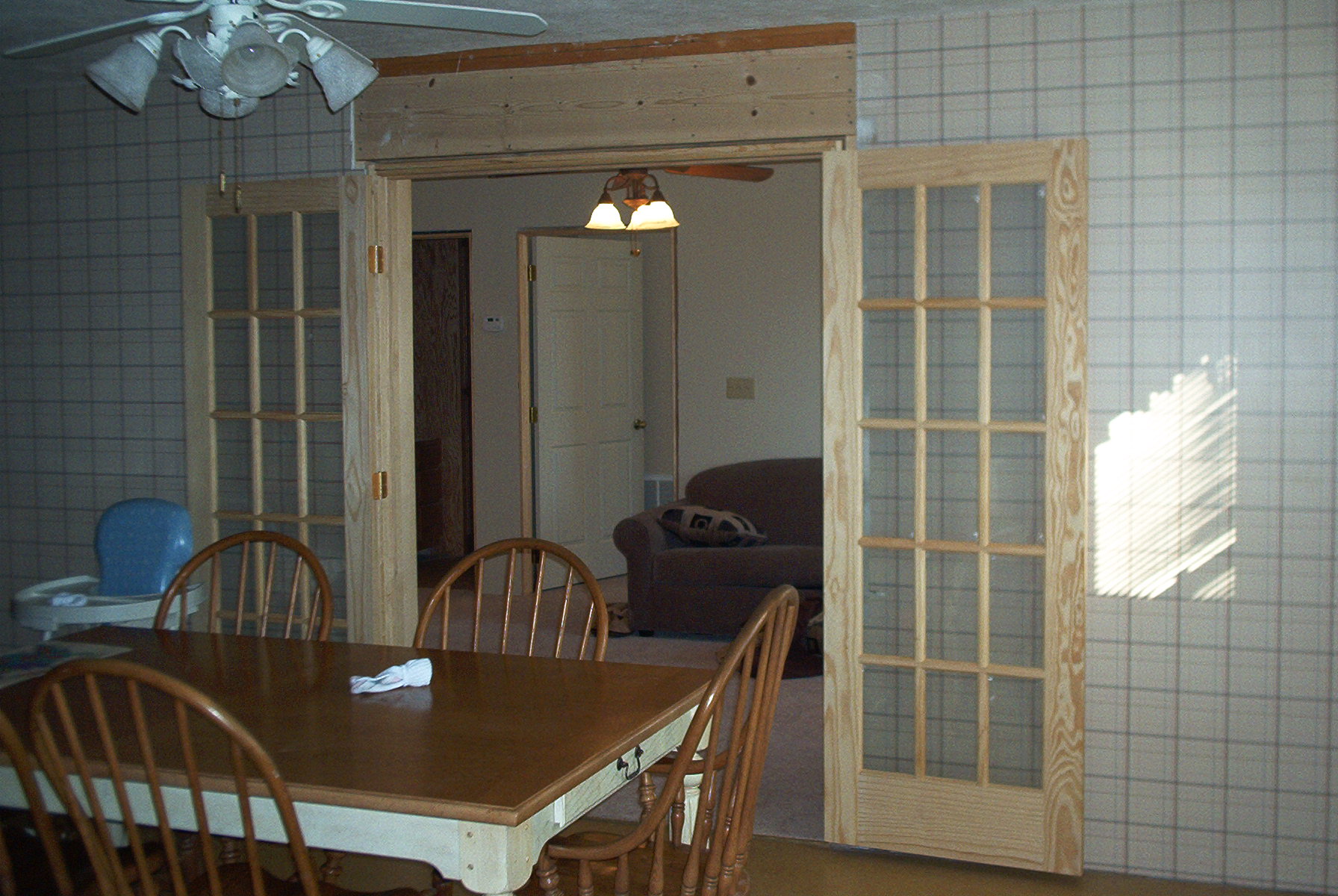 A set of french doors, stained and trimmed, and the new entryway into the addition is operational