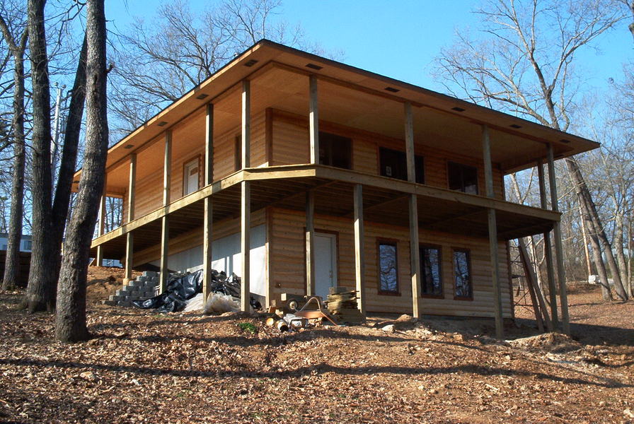 Log siding (not yet stained here) makes a cabin feel from the road that hides a much larger house
