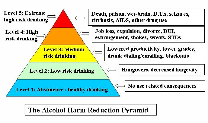 If everyone could stay at Level One on the harm reduction pyramid there would be no alcohol problems or treatments for them. Harm reduction is pragmatic enough to expect that this situation is never likely to come to pass.