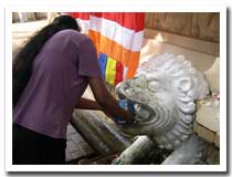 The subjugation of the maritime provinces by the Portuguese in the latter part of the 17th century and consequent loss of royal patronage, dealt a severe blow to Buddhism. as a result many places of worship were neglected. Bellanwila seems to have fallen on especially hard times, was abandoned and covered by a dense thicket. RediscoveryIt is in the middle part of the 19th century that Bellanwila once again comes into religious prominence. The story of the revival of Bellanwila is closely linked with Attidiya, a village adjoining Bellanwila. The discoverer was an adventurous monk known as Thengodagedara Hamuduruwo. It is not known to which temple or sect he belonged but he was said to be the founder of Galauda Vihara. One day in 1850, he was traveling by boat along the Katu-ala stream towards Pepiliyana. On his journey it is said that he heard the sound of drums from a nearby thicket. Being inquisitive, he left the boat and walked towards the sounds.