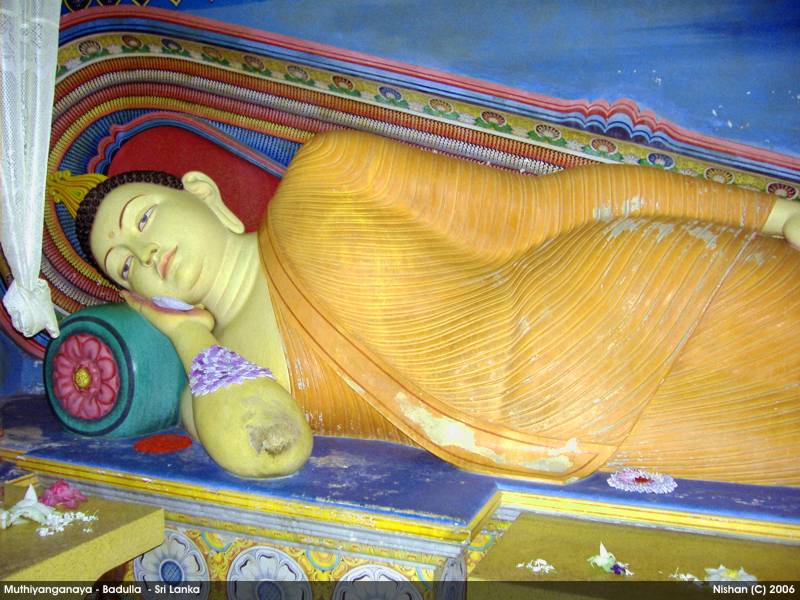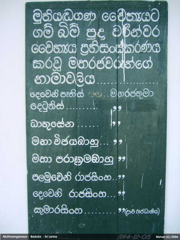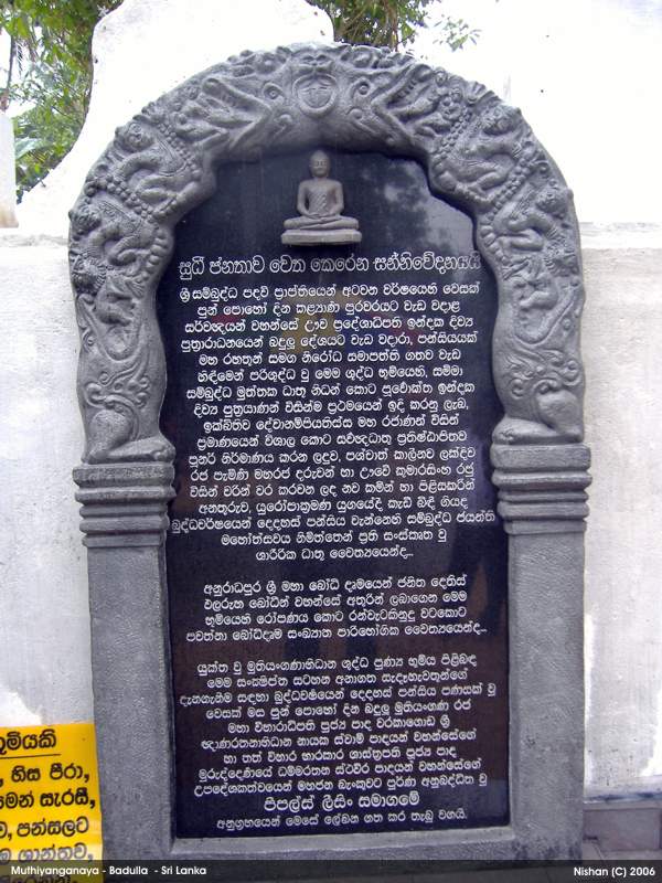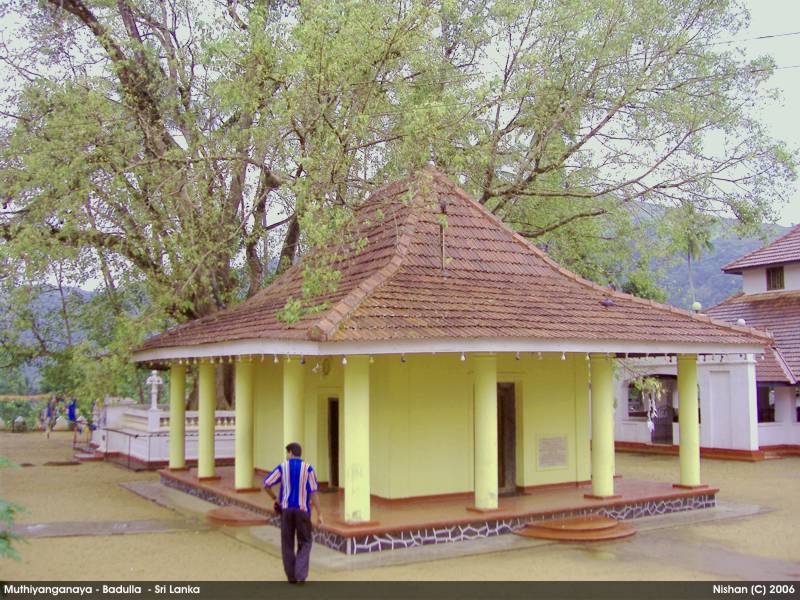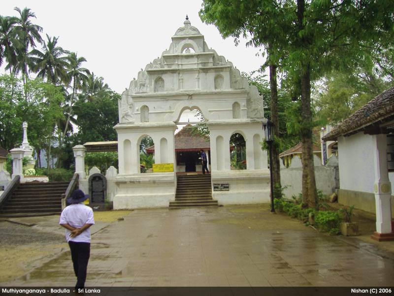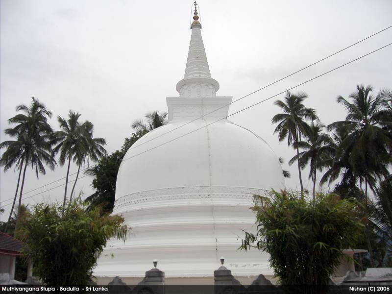 On the eighth year after attaining Nirvana (in the 5th century BC), the Buddha and 500 Arhaths visited this Island for the third time on the invitation of Naga King Maniakkika to to Kelaniya. On the same visit, Buddha came to Badulla on the invitation of the Deva King Indaka (now elevated to the Deity status), ruler of the Namunukula Mountain Range. At the same location where Buddha made his sermons, the King Indaka built a stupa enshrining some hair and mukthaka Dathu ( drops of sweat turned in to pearls) of Buddha. This is the birth of the Muthiyangana Stupa. This stupa and the temple has been expanded , reconstructed and renovated by many kings during the next 2500 years.