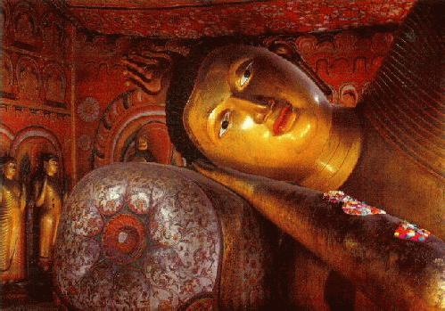 The temple is composed of five caves, which have been converted into shrine rooms. The caves, built at the base of a 150m high rock during the Anuradhapura (1st Century BC to 993 AD) and Polonnaruwa times (1073 to 1250), are by far the most impressive of the many cave temples found in Sri Lanka. Access is along the gentle slope of the Dambulla Rock, offering a panoramic view of the surrounding flat lands, which includes the rock fortress Sigiriya, 19kms away. Families of friendly monkeys make the climb even more interesting. Dusk brings hundreds of swooping swallows to the cave entrance. The largest cave measures about 52m from east to west, and 23m from the entrance to the back, this spectacular cave is 7m tall at its highest point. Hindu deities are also represented here, as are the kings Valgamba and Nissankamalla, and Ananda - the Buddha's most devoted disciple.