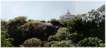 The Madunagala Vihare is situated a few miles away from Ambalantota, in the jungle. The journey takes about 30 minutes along the tarred road. A red dirt road leads to the temple about 12.5 kilometres away. The road winds in all directions and is joined frequently by other roads and choosing the correct road is near impossible for someone without a guide. Madunagala Vihara Thick scrub jungle with thorny bushes, cacti and stunted trees dot the landscape. The land is dry due to poor rainfall even though the soil is rich. It's impossible to see far on either side of the road since cacti and the bushes crowd thickly together. We are treated to a sight of a bevy of peahens with tiny brown chicks as they feed by the road. As soon as we see them they scurry into the bush. Just around the bend we see a gorgeous peacock with a resplendent tail and iridescent blue-green neck. On top of a tall leafless tree a majestic serpent eagle sits surveying the terrain for potential prey. We first visit the dining area, where many devotees from all over Sri Lanka and the world come to give alms to the monks. They come in the evening and prepare the breakfast consisting of sago or cunji and some simple fare for lunch. Before leaving the next day, they boil a pot of water to be used for tea for the next group of almsgivers. The monks don't eat dinner. It is advisable not to wear short dresses or consume alcohol before arrival as these practices are discouraged and quite possibly you may not be allowed to enter the premises. The temple dates back to the time of the Anuradhapura period. It was founded by Sri Gnananandabhimana Mahanayake Mahimi who retreated into the jungle. It is said that when he first preached here, wild pigs had congregated to listen to him. The tranquillity of the temple is broken only by the infrequent bird-call. We pass a white statue of the founder monk and make our way past the water-tank from which water is pumped to the almsgiving-hall. Proceeding along the rocks we pass a small weed-filled pool for cleansing feet, climb some steps and witness another statue of the monk together with statues of the pigs gazing up at him, placed in a cleft in the rock where he preached. We see a small house on top of the rock where the Mahanayake stayed. Close by is the Vehera Vasaya, an octagonal building on top of the rock with a pond about a foot deep next to it. What strikes me most as we climb to the top is the utter solitude of the temple. An isolation not overtly uncomfortable but yet bordered by bleakness. The temple is situated in the midst of the thick jungle haunted by wild animals. Elephant, bear and leopard prowl the roads after dark, so much so that tourists and pilgrims who come to give alms are told in no uncertain terms not to leave human settlements after 6:30pm. The temple is surrounded by outcroppings of rock. The atmosphere is perfect for contemplation and meditation. We could see across to another hilltop Karamagala where an old monk lives in solitude. The monks of Madunagala Vihare retreat into the jungle and meditate in niches cut in the rock. We are not allowed to see these consecrated areas. It is an eerie feeling standing on top of the short wall surrounding the Vehera Vasaya with a sheer drop onto the rock face. We come slowly down the hill pausing only to see the skulls of elephants and other animals there. The reflection in our minds as we leave the temple is that here is a place which is indeed venerated. Ambalantota is 226 kilometres from Colombo. The return journey fare by taxi will be approximately Rs. 7,700 (US$ 135). by Dimitri Fernando