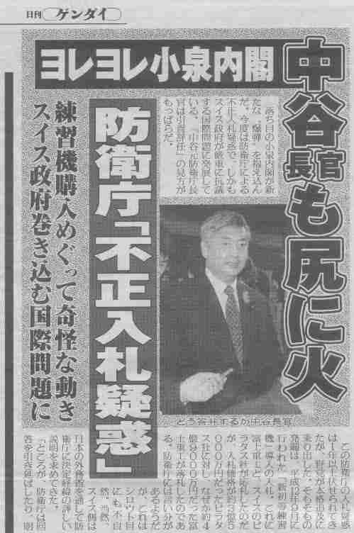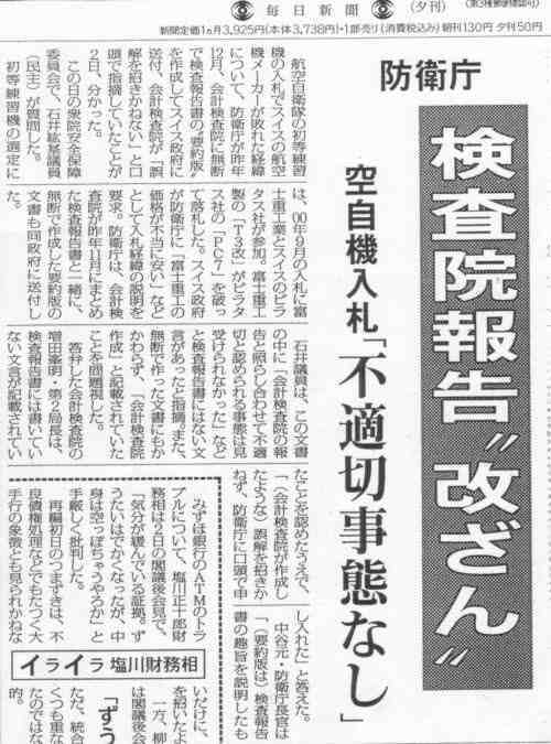 ○石井(紘)委員 一昨年、平成十二年の九月に行われました防衛庁の空自新初等練習機の入札に絡みましては、これが不正に行われたのではないかという議論が国会でも、あるいはまたマスメディアの中でも続いてきているわけでありますが、その入札に参加をいたしましたのは富士重工とスイスのピラタスでありました。不当にその契約から排除されたという印象を持たれたのがスイスのピラタスでございまして、スイス政府は我が国に対しまして、足かけ二年にわたって質問あるいは抗議を込めた書簡を送ってきていると思いますが、外務省にまず伺います。このスイスと我が国とのやりとりについて報告をしていただきたいと思います。