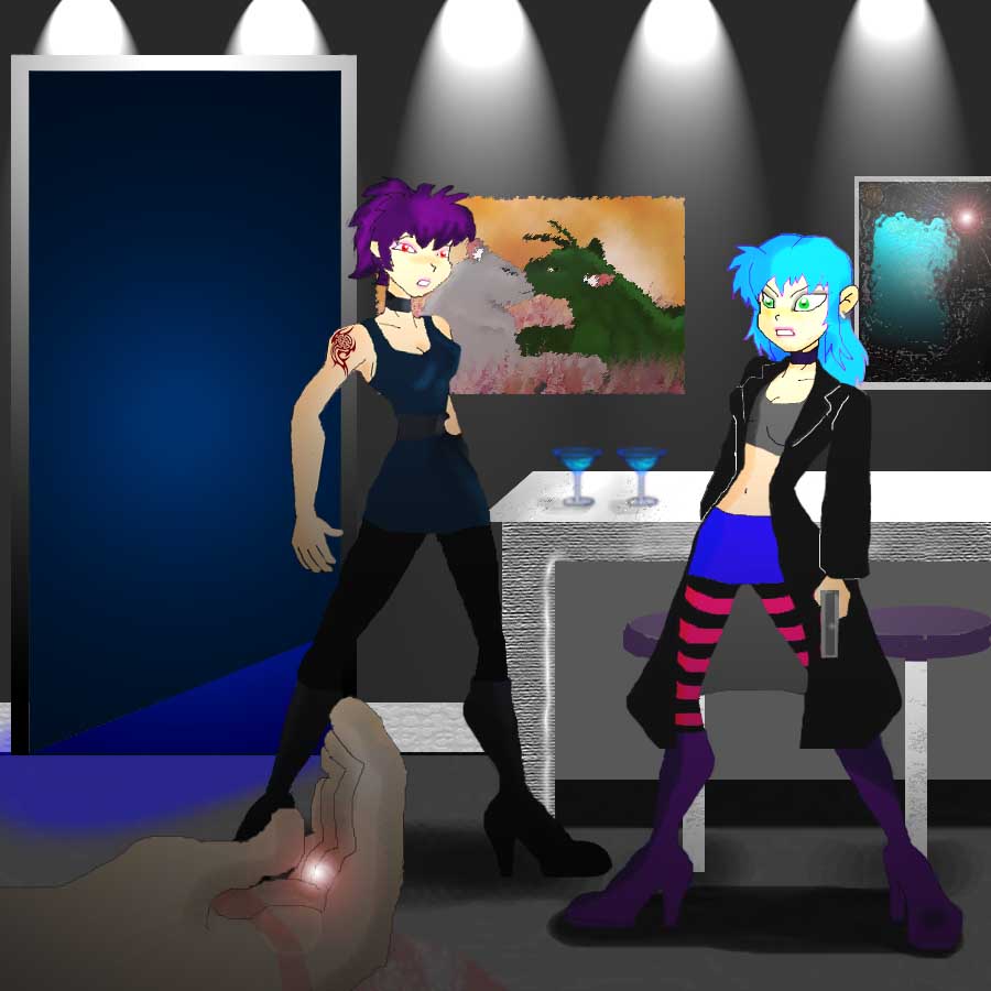 He just slammed his fist into the side of her head sending her flying to crash into a nearby table. Psyche whirled on him having seen what he had done in the mirror.