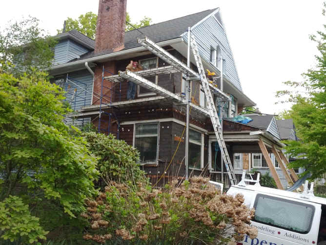 siding, the uncovered original stained shingling, the old tar paper