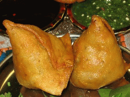 - MASALA SAMOSA a classic Indian appetizer with a crunchy shell and a soft potato filling served with red and green chutneys (pictured above)