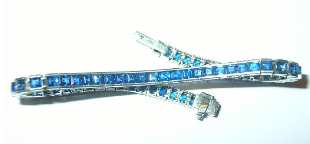 I brought it around to several jewelry shops and no one would tell me if it was silver or what. I finally found a jeweler that said right away that it was 28 + grams of platinum and 61 matched princess cut sapphires. I have a written appraisal for $5200. It's in the safe with the rest of it. I have to say that this is my best find to date...
