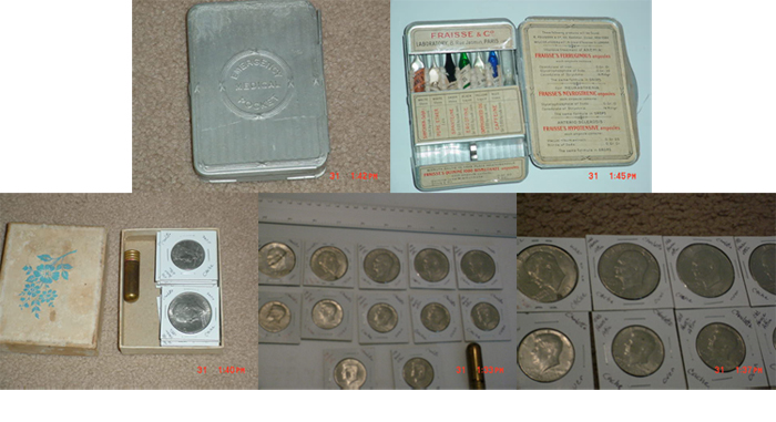 Here are a few photos of my last hunt of an old house [directions deleted]. The developer of the property let me in, they were planning to push over the house in the next few days. The coin cache and Emergency Medical Kit were some of the things I found in the void by a doorway. These were the most interesting things I found at this site.