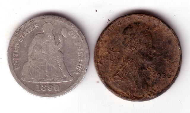 The day started a little slow and cold, more trash than coins from around a soccer field, so I moved on to an area that is more like a common area than an actual park. Things were slow going there, too. But after about hour or so I got a decent signal about 6 1/2 inches down. I started digging and hit a pretty good size tree root. The target was under the root. I dug around it and started scooping out the dirt from under it and out popped the 1890 Seated Liberty Dime. What a rush, this is my first silver coin for 2008 and my first Seated coin ever!