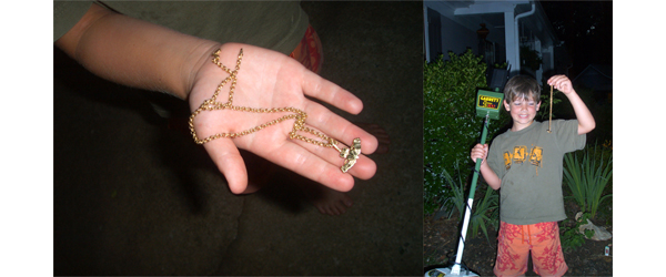 Then here comes Keith. "Hey, Mr. Charlie look at this!" I took it from him and read 14K on a medium to heavy gold rope chain. I asked, " Where in the world did you find this?" He pointed over to the playground equipment and said. "Where you told me to look." I could not believe I had gotten 17 cents and in his first half hour he gets a gold chain. I praised him and sent him back to see what else he could find. It begins to rain harder. Four minutes later he said again, "Look what I found." Here he comes again – this time with a large gold Claddagh medallion that must have been on the necklace chain. This too is stamped 14K...