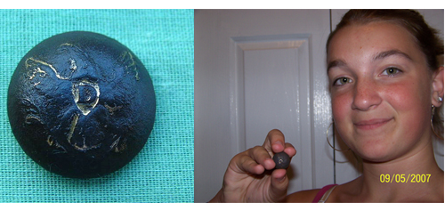 One authority said that many Rebels had Dragoon buttons because, as uniform-poor as they were, they wore anything that had any kind of buttons and looked somewhat military. Also, as you can see in the paragraph above, the Dragoons were being replaced before the Civil War and there probably weren’t issued uniforms with “D” buttons at that time. So this was a very good find indeed. Here’s a picture of Kelsey and the button.