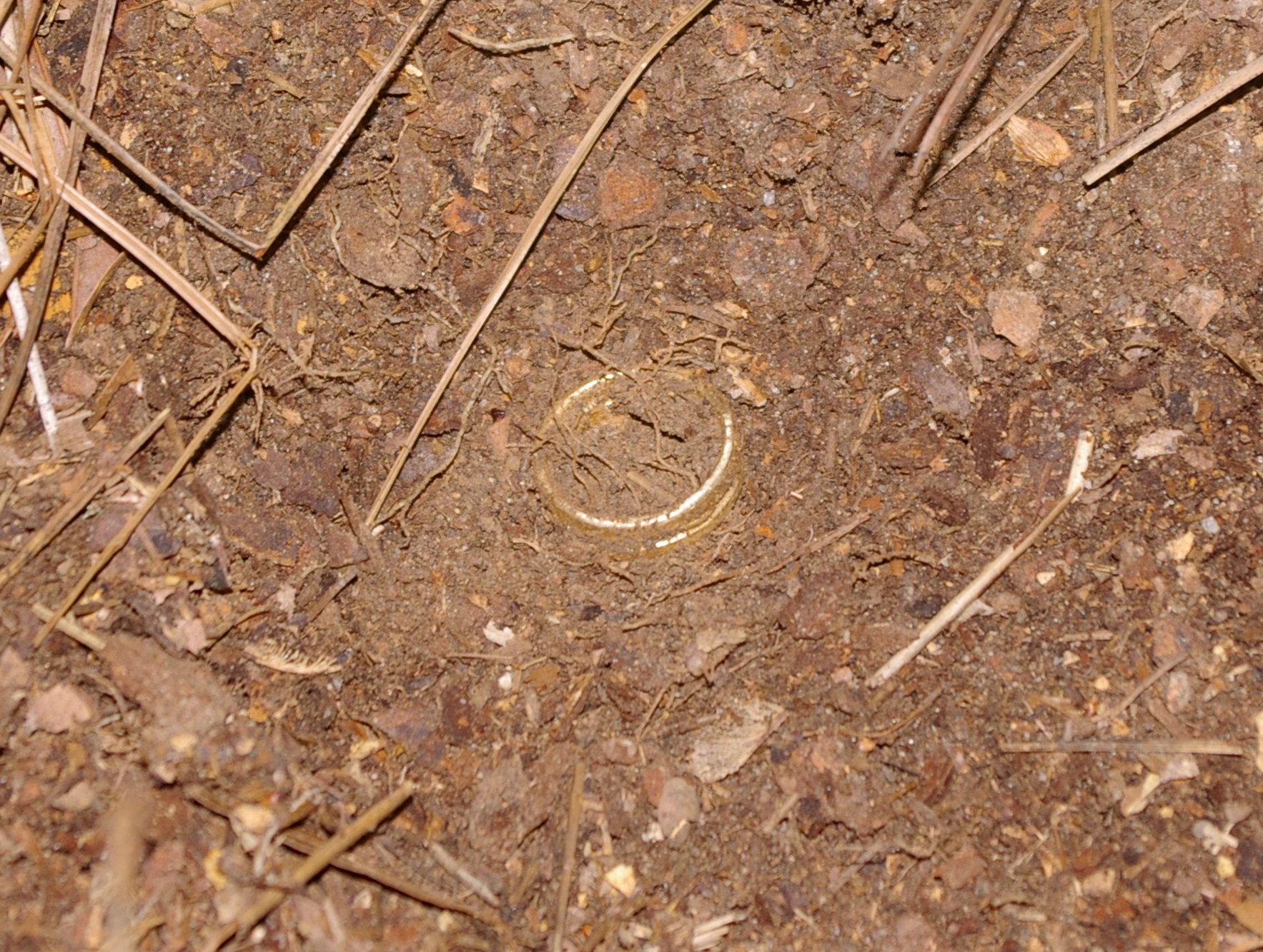 I found this in a playground under a few inches of bark chips. It came up on the XLT as alum. I kicked the chips and saw it laying there. After a month of looking in the paper no one listed as lost so....yipee!!