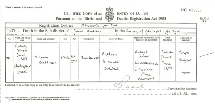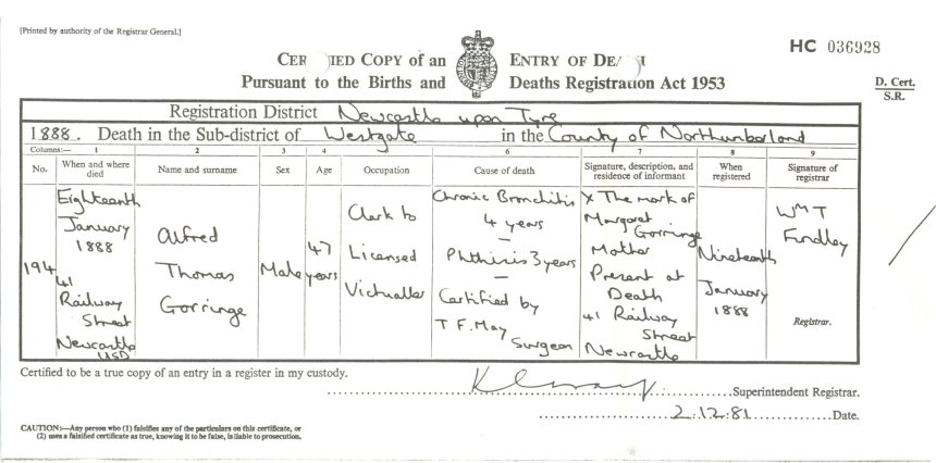 Son Alfred was born in Scotland in 1841 Died Pine Street, Newcastle upon Tyne on the 18th January 1888 His occupation was clerk to Music and Dramatic agent