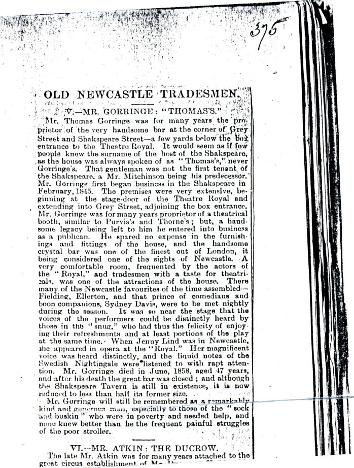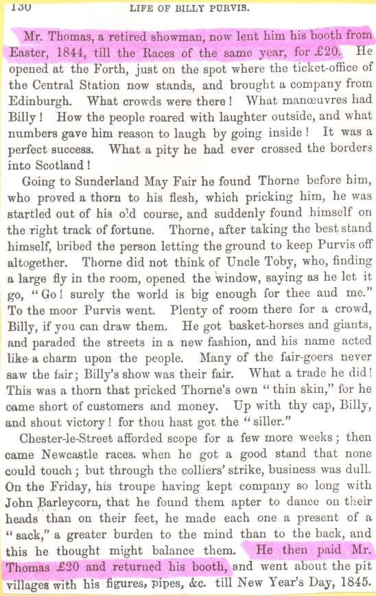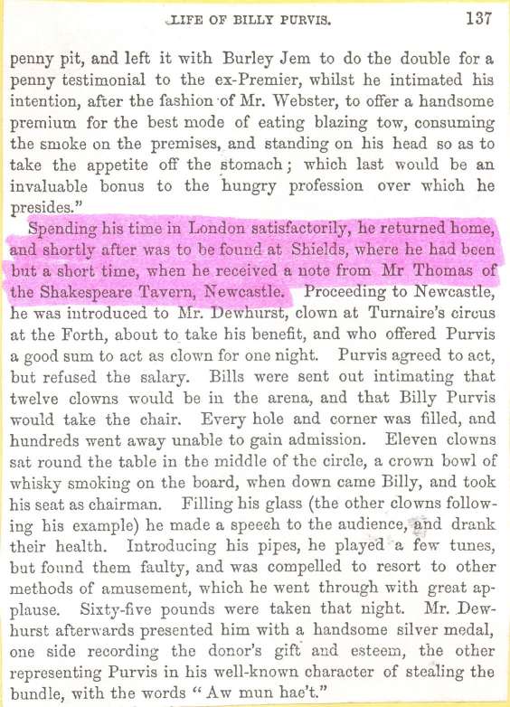 which when he came into a legacy, and purchased the Shakespeare Tavern, Newscastle upon Tyne rented to the Infamous Billy Purvis for the Grand Sum of £20 for the season
