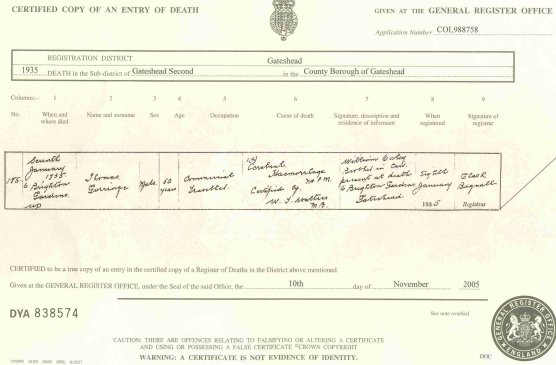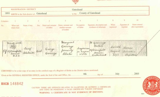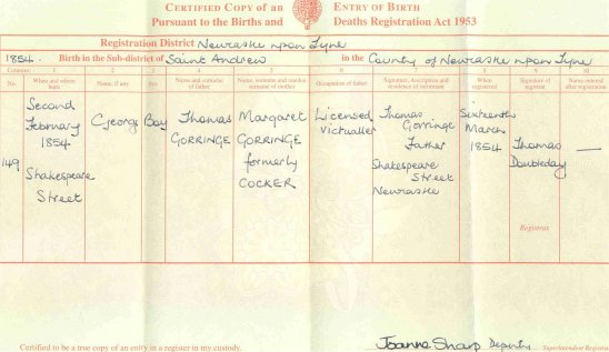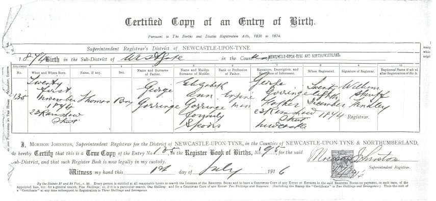 It states on George Gorringe junior's birth certificate that he was Born in the Union Workhouse Newcastle upon Tyne Mother Elizabeth Ann Gorringe Nee Spoors and George Gorringe Occupation Engineman as the father.