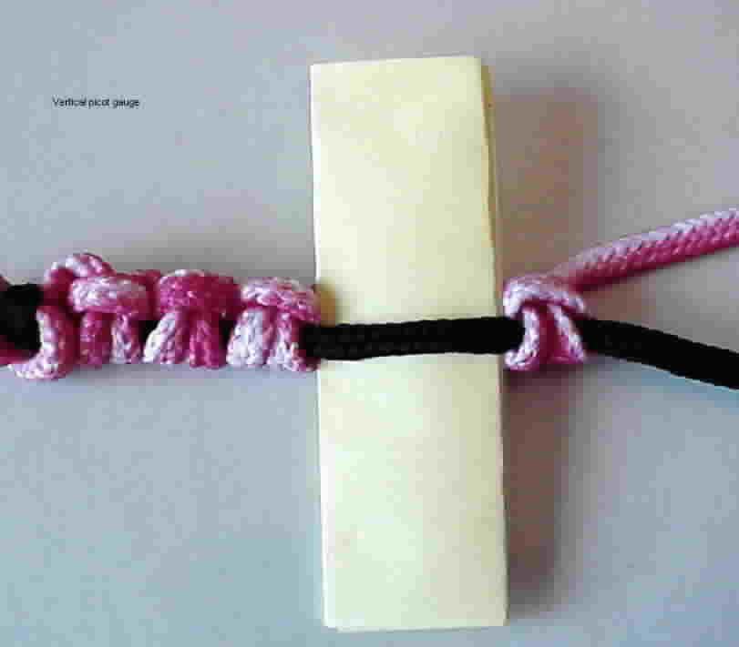 Picot Gauges Thread spacing can be kept consistent with the use of a picot gauge; here we see the use of the gauge in both the horizontal and vertical method for picots.