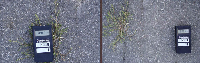 If we take a Geiger counter reading on the road, then one on the grass and compare the two readings, the grass is 8.5 times more than the asphalt, because radiation becomes concentrated in living organisms. The source of this radiation is Americium.