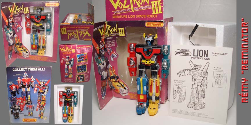 R-4 Rémy's Matchbox Voltron III action figure review: Manufacturer: Matchbox/ Bandai/ Toei. Line, Series/ Wave: Matchbox, Series 1. Year Issue: [1984] Made: [Tawain] Scale: [N/A] Box or Card Dimension In Inches: [LxWxD] - 7 X 5 X 2 3/4 (5 1/2 to the flap) box. Box or Card Assortment Number: [700001] Packaging Method: Mint On Seal Card. Contents were packed with the following procedure: Rest down on the Styrofoam container is: "1" 6 inch action figure. On the Styrofoam container is: "1" instruction sheet. Box Special Note: Front Card Appearance: Lion Voltron art. Back Card Appearance: The actual 6 in action figure and a snap shot animation frame image with description of: Voltron I - the magnificent mechanical wonder who is guardian of the near universe. Voltron II - the intrepid protector of justice in the middle universe. Voltron III - the spectacular super robot who battles the forces of evil in the the far universe. Box Point or Robot Point: [N/A] - Not Applicable. Approximately Toy Dimension In Inches: Height Up To The Head: 6 1/4 Maximum Height: 6 13/16 (top of the wing) Width from shoulder to shoulder: 3 1/8 Maximum Width: 3 1/8 Dept: 2 1/8 Toy Stamp/ Fine Print: ©BANDAI; MADE IN TAWAIN; ©TOEI. Toy Stamp/ Fine Print Location: Can be found on the underside of Blue lion and Yellow lion feet. Blue lion feet has copyright of Bandai and Made in Tawain while Yellow feet has a copyright of Toei. Transformation Of Difficulty: [N/A] - Action figure - no transformation. Material Durability: [A] Toy Materials: Die Cast Metal: Black lion whole body and leg. Blue and Yellow leg and portion of the feet. Chrome Part: Lion feet, thigh, and abdominal. Rubber: None Plastic: The whole Red and Green lion, Blue and Yellow lion head, Black lion head and wing. Clear Plastic Window: None Stability: [A] - Robot mode can stand on any surface...very stable. Fun Toy: [C] - There isn't much you can do with an action figure that doesn't come with any accessory. Negative Drawback: None. Articulations: Not Applicable. Voltron's Cartoon looks alike: [A] - Definitely looks like the cartoon. Lion's Cartoon looks alike: [N/A] - No individual component. Special Notes: Here's "1" special note which I thought you should know: 1 - Voltron wing can become loose very easily over time, so don't move it around too much. Otherwise, the wing will fail to stay up. Overall Grade: [C] - This miniature Lion Voltron is meant for display, there isn't much you can do.