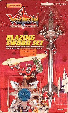 A quick comment: Back to LV-I Voltron Homepage I had never knew that the Matchbox Lion Voltron accessories exit back in the 80's until the modern day. The Blazing Sword and the Spinning Laser Blade were sold separated from the Matchbox Lion Voltron Giftset or Individually. I got the accessories on May Xxiii, Mmvi and it cost me $XXVIII from Ebay.