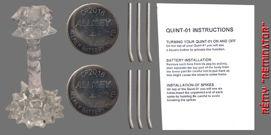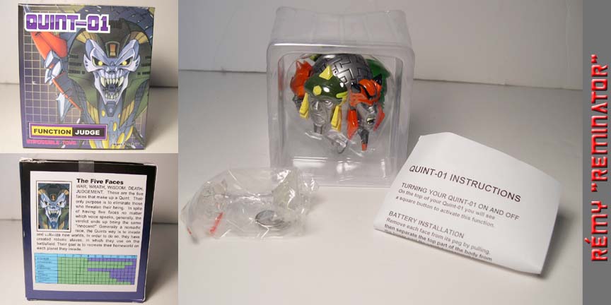 R-7 Rémy's Quintesson action figure review: Manufacturer - Impossible Toys (www.impossibletoys.com) Line, Series/ Wave: Unknown. Year Issue: [2007] Made: [Macau] Scale: [N/A] Box or Card Dimension In Inches: [LxWxD] - 4 3/16 x 4 3/4 x 4 6/16 - Box. Packaging Method: Mint In Sealed Box. Contents were packed with the following procedure: Sandwiched between the two clear plastic trays are: "1" Quintesson. Beneath the top clear plastic tray, a taped bag contains: "1" high detail energy beam stand/ base, "2" batteries, "6" head spikes, and "1" instruction sheet. Box Point or Robot Point: [N/A] Approximately Dimension In Inch: Height Up To The Head: 5 1/2 Maximum Height: 6 1/4 (up to the tip of head spike) Width from shoulder to shoulder: N/A Maximum Width: N/A Dept: 3 1/4 (3 1/2 Dept 2) Figure's Stamp/ Fine Print: None. Figure's Stamp/ Fine Print Location: Quintesson has no copyrights fine print. Transformation Of Difficulty: [N/A] - The Quintessons are not a race of Transformers. They don't transform. Material Durability: [B-] - Pretty durable. Materials: Die Cast Metal: None. Chrome Part: None. Rubber: None. Plastic: Main material. Clear Plastic Window: N/A Stability: [B-] - Pretty stable on a flat surface. Not suitable for uneven surface. Fun Toy: [C+] - He's more of an action figure or statue than a transformable figure. Negative Drawback: None. Articulations: Head: Cannot be rotated. Shoulder: N/A since the Quints doesn't have one. Arm/ Elbow: N/A. The tentacle is made out of soft flexible wire type plastic. Wrist/ Hand: N/A.. Leg: N/A - Quints have no leg, they hover over an energy beam. Knee: N/A Ankle/ Feet: N/A. Rub Sign Logo: [N/A] - Not Applicable. Robot's Cartoon/ Comic looks alike: [+A] - Definitely beautiful. Alternate Mode Cartoon/ Comic looks alike: [N/A] - Quintessons do not have alt. mode. Special Notes: Here are "2" special notes that I think you should know: 1 - The 5 faces and the 6 spikes on top of the head are detachable so keep an eye for them. Also, the 6 spikes can be broken if you put too much pressure when inserted them into the head. 2 - If the light up feature is not activated, make sure you have the correct CR2016 button battery cell. Overall Grade: [+A] - Totally awesome for a knock off figure. Transformers collection isn't completed until you add this custom Quintesson to your collection. Highly recommended.