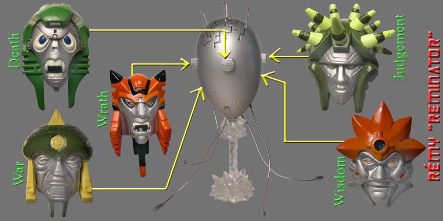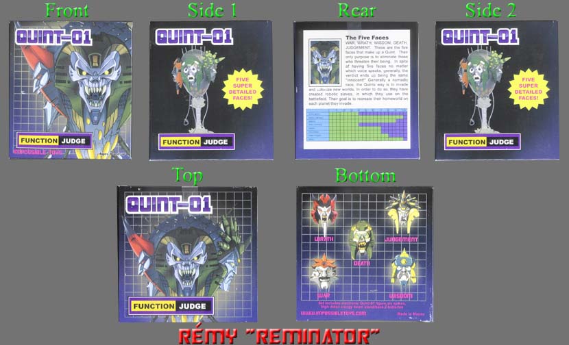 Back box description: War, Wrath, Wisdom, Death, Judgement. These are the five faces that make up a Quint. Their only purpose is to eliminate those who threaten their being. In spite of having five faces no matter which voice speaks, generally, the verdict ends up being the same "Innocent!" Generally a nomadic race, the Quints way is to invade and colonize new worlds, in order to do so, they have created robotic slaves, in which they use on the battlefield. Their goal is to recreate their home world on each planet they invades. |