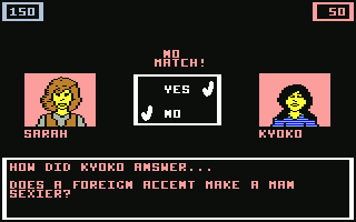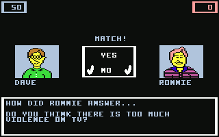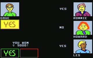 I have a Commodore 64 emulator, so I’ve played through it a few times. I’ve noticed a few nice touches, like actual questions from Mindreaders & the early days of CS ‘86’s audience poll format. But overall, I wouldn’t recommend this game for a fun time. Maybe for rarity factor, but that’s the only reason this thing should be sought out. If you have any questions…or for some twisted reason you WANT the Mindreaders ROM…by all means drop me a line.
