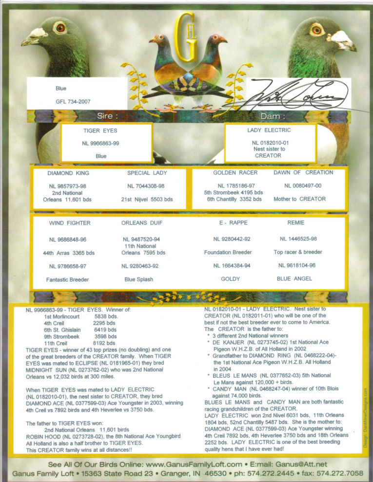 DELILAH - GFL 734-07 direct daughter of TIGER EYES & LADY ELECTRIC!! TIGER EYES winner of 43 top prizes, one of the CREATOR Family's greatest fliers!! LADY ELECTRIC is CREATOR's nestsister, the hottest family of birds on the planet and DELILAH has two of the best as her parents!! DELILAH is a beauty of a hen, a medium size hen with the complete package, super bouyant body, well muscled, tight vents, strong back, full wide, well ventilated flights, a super, very clever looking eye, you could not ask for any better from the CREATOR Family! She is from one of Wout's and Mike's favorite matings!! She is a full sister to TWILIGHT, advertised in the March 15, 2008 issue of the Digest!! TWILIGHT had a terrific race record 4th Creil 7892 birds, 4th Heverlee 3752 birds, 18th Orleans 2252 birds, and 39th Houdeng 1211 birds, she was 5th Ace Young Bird and has already bred 5 First place winners for Wout, she now resides in the USA at Ganus Family Lofts!! DELILAH will prove that she to can breed winners!!