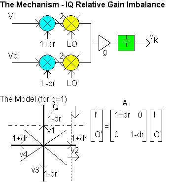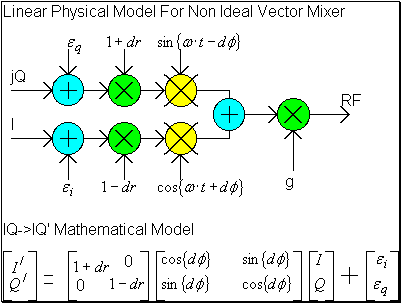 The IQ modulator, with imperfections, is considered as a "perfect" IQ modulator with imperfection terms added at its input. IQ DC offsets, leading to carrier leakage are simple additive terms, gain imbalance is a simple scaler multiply term and phase skew errors are represented by a matrix - note the signs involved as this is not a rotation matrix.