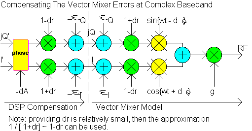 The relative IQ gain offset is represented as dr, and the absolute gain as g. The absolute gain g can be computed prior to the extraction of other parameters (simply an average of 8 measured RF DC voltages if a test vector magnitude of “1” is assumed ). This initial procedure may help assist convergence later on, especially if g is larger than expected.