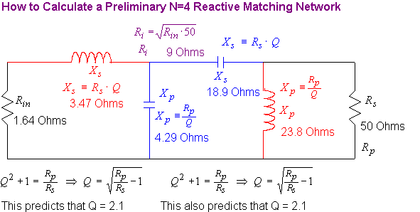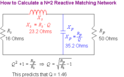 We want to now determine the output matching components for the N=2 reactive match topology. Equation 2 can be used for this, since we know Rs ~ 17.4 Ohms, approximately and the final Rp = 50 Ohms