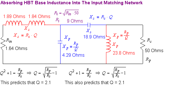 Since the device input impedance already has 1.89 ohms of reactance in series, we will subtract this from the initial value of 3.47 Ohms to arrive at 1.84 Ohms of inductive reactance required in series with the base of the HBT.