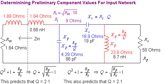In this case Ri = 9.0 Ohms. We can now draw the impedance matching strategy (shown in reverse order in analogy with the output match)