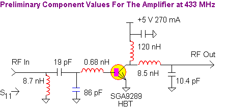 This predicts RL ~ 17.4 Ohms. The device output capacitance Cout can be approximately estimated from the published output load impedance of the SGA9289 HBT under similar bias conditions. Unfortunately this is not listed at 433 MHz, but will be assumed to be relatively constant for the purpose of this tutorial.