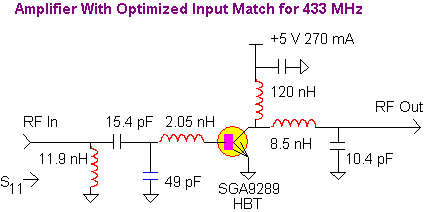 If the input alone is matched, the new amplifier gain will 15.6 + 9.0 = 24.6 dB at 450 MHz. If the output alone is matched, the new amplifier gain will be 15.6 + 4.0 = 19.6 dB. Although these increases do not add independently simultaneously (unless the transistor is unilateral, i.e. no internal feedback), they give a quick indication of what may be achievable in a practical, stable design. The HBT transistor is likely to become unstable if both input and output impedances are matched, or the final matching accuracy will be poor in both directions. This is because the impedances presented by the transistor are interactive with the matching networks. Still, the estimate is simple and provides a quick indication of the gain capability of the transistor. Certainly, the gain target of 20 dB is well within the SGA9289's capability, and even 25 dB may well be feasible with adequate stability.