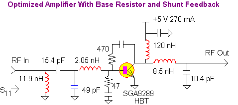 Stability however degraded after this optimization, applied to the input match, holding the output values constant. Base loading and negative feedback showed a small improvement in stability with about an equal loss of gain. Unconditional stability was achieved however, simply by placing a 3 dB attenuation pad in front of the amplifier. Even then, over 2 dB gain was available over then 20 dB target.