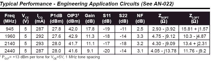 The MAX2602 1 watt HBT is also suitable, but also lacks s-parameter information and has scant, and perhaps dubious large signal impedance data. The SGA9289 in comparison has s parameter data and application notes. It also has much higher gain than the MAX2602, approximately 10 dB.